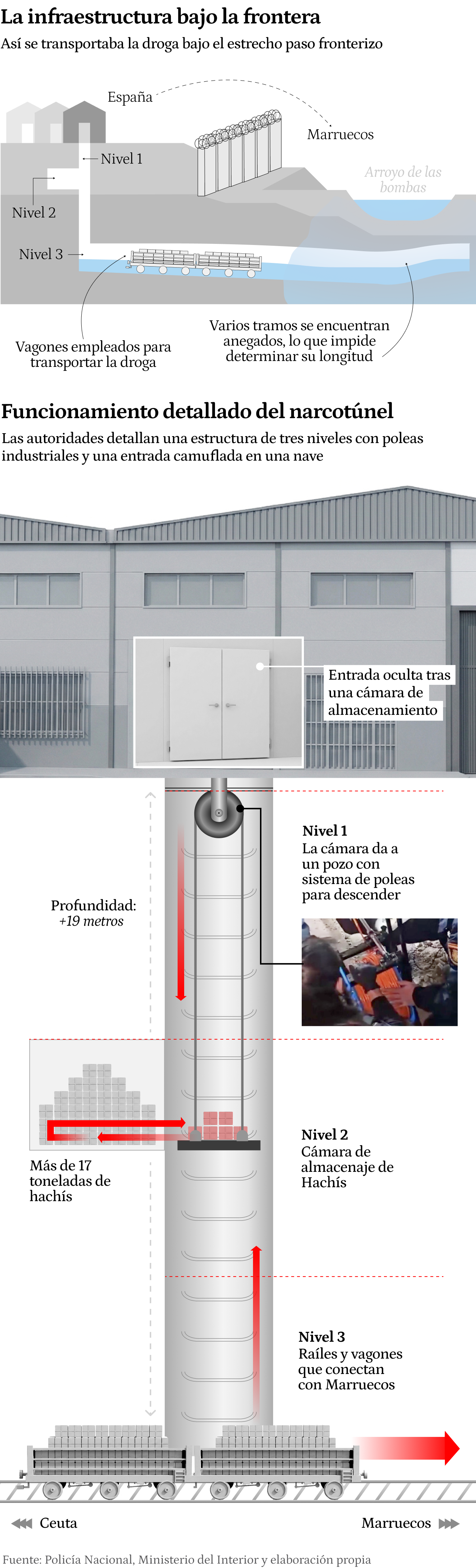 ووفق المعطيات ذاتها، فقد كانت هذه الأنفاق تُستغل لتهريب ما يصل إلى 8 آلاف كيلوغرام من الحشيش شهريًا، أي ما يعادل طنين أسبوعيًا على الأقل، ما يكشف حجم النشاط الكبير للشبكة. النفق المكتشف حديثًا يوجد بالمنطقة الصناعية “تاراخال” بسبتة، على عمق يصل إلى 19 مترًا تحت الأرض، فيما لم يتم بعد تحديد طوله الكامل أو نقطة نهايته داخل التراب المغربي.