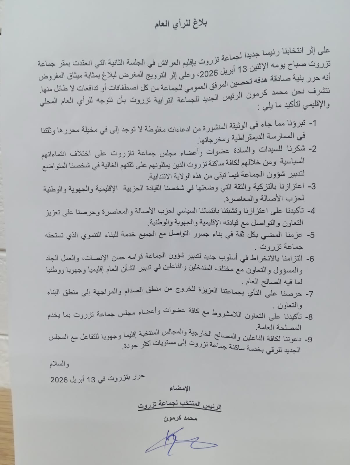 خرج محمد كرمون، الرئيس المنتخب حديثاً لجماعة تزروت بإقليم العرائش، ببلاغ رسمي لتوضيح موقفه من وثيقة تم تداولها على نطاق واسع، وُصفت بأنها ميثاق لتنظيم العمل داخل الجماعة، وذلك مباشرة بعد انتخابه خلال جلسة عقدت يوم الإثنين 13 أبريل 2026.